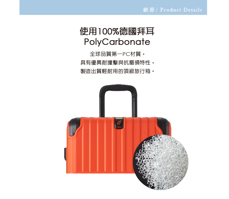 • 材質:箱殼 100% PC;內裡 100% POLYESTER