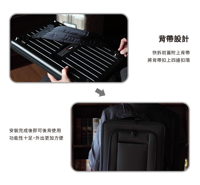 • 前袋可依不同需求及場合搭配並可獨立使用