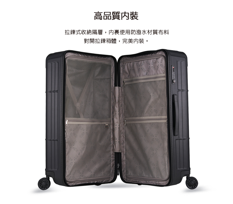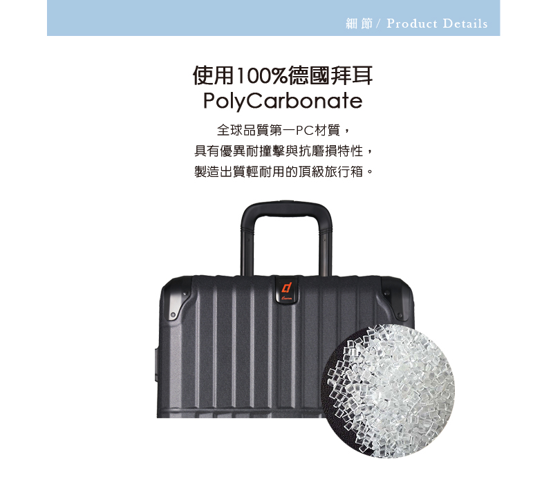 • 材質:箱殼 100% PC;內裡 100% POLYESTER