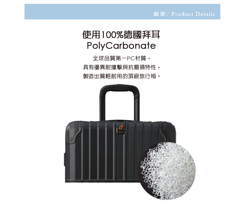 • 材質:箱殼 100% PC;內裡 100% POLYESTER