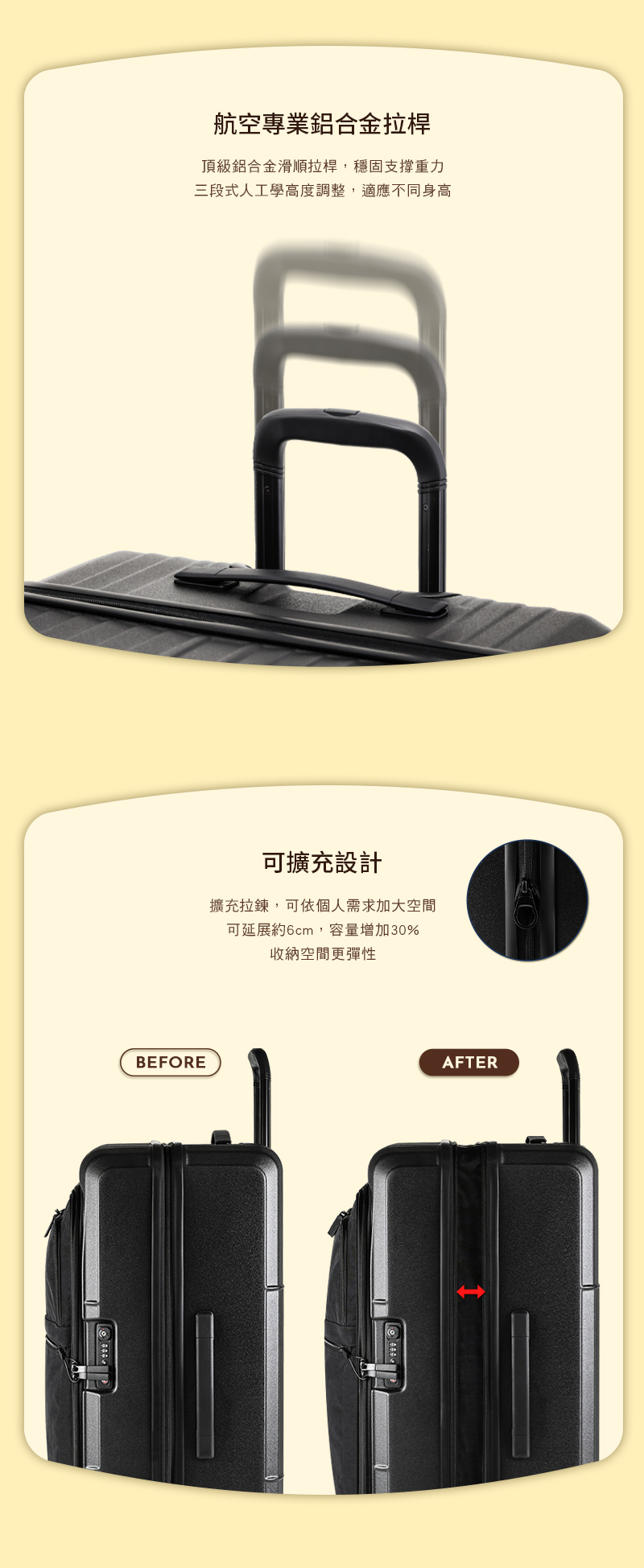 • 三段式符合人體工學的頂級鋁合金滑順拉桿