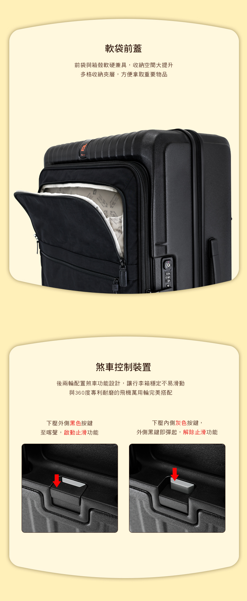 • 後兩輪配置煞車功能設計,讓行李箱穩定不滑動