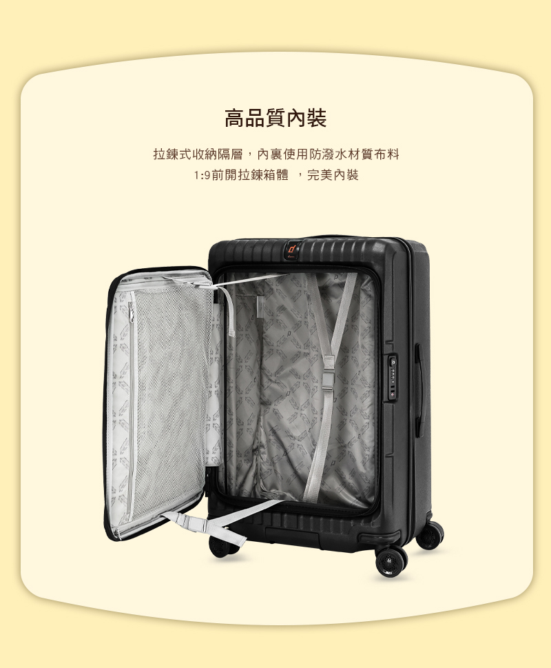 • 材質:箱殼 100% PC;內裡 100% POLYESTER