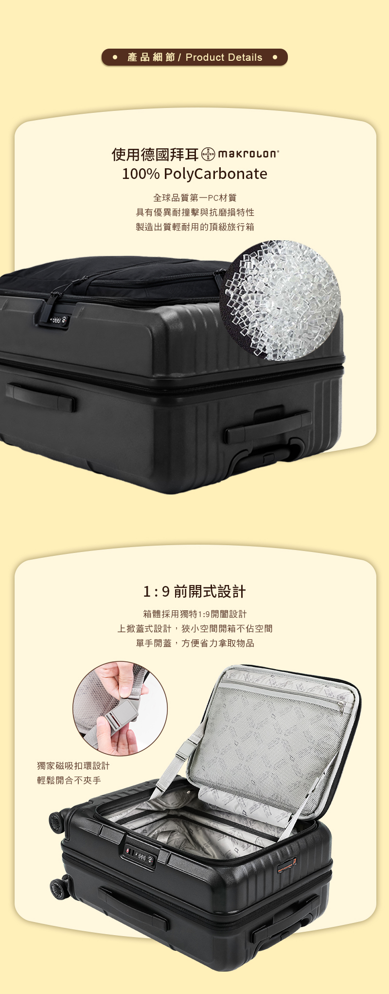• 箱體採1:9 前開式設計,搭配獨家磁吸式扣環;輕鬆開合不夾手