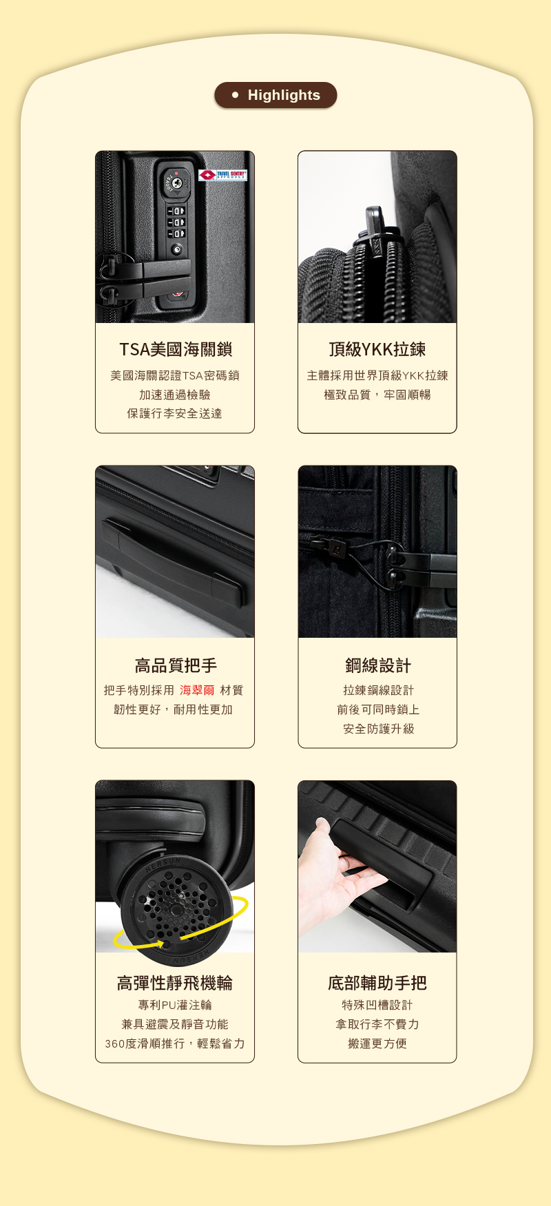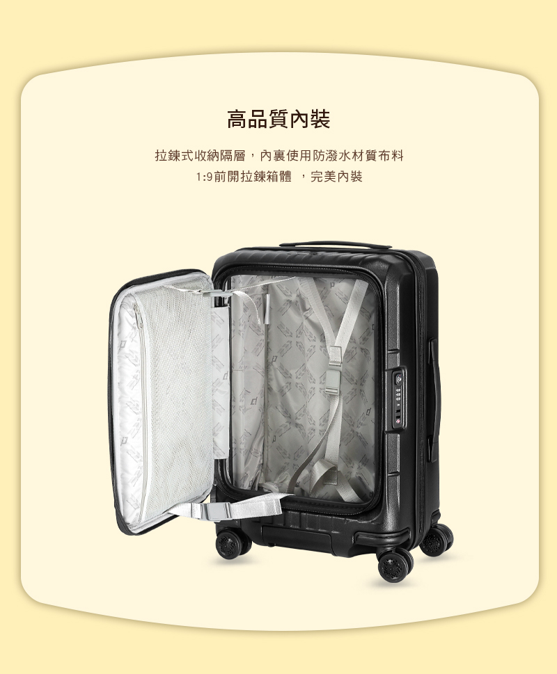 • 材質:箱殼 100% PC;內裡 100% POLYESTER