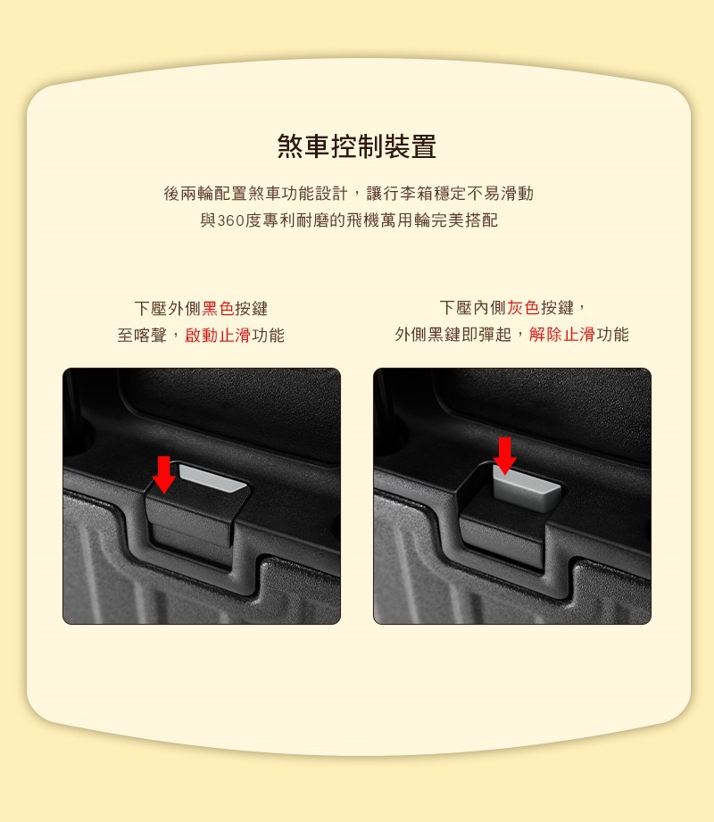 • 後兩輪配置煞車功能設計,讓行李箱穩定不滑動