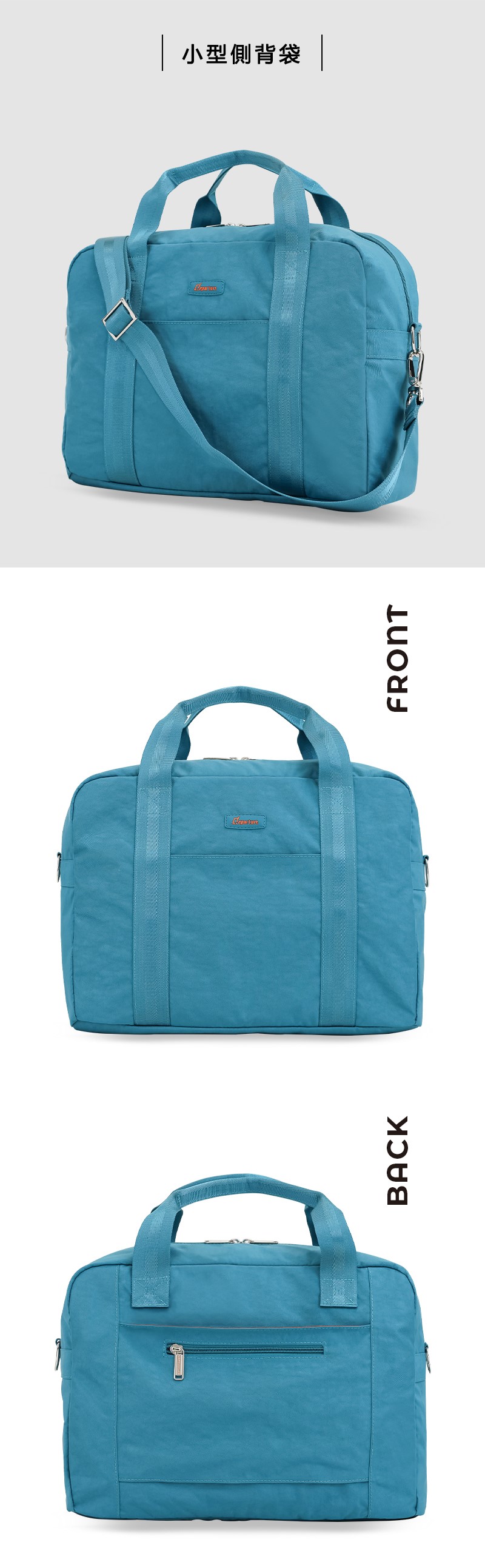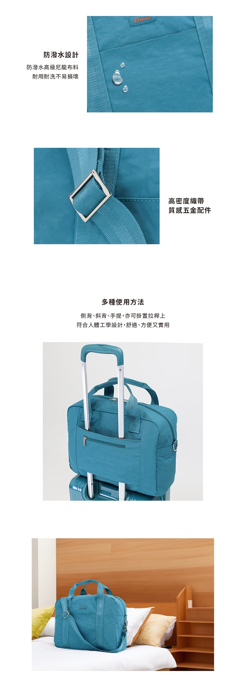 • 側背、肩背、手提,亦可套掛至行李箱拉桿上
