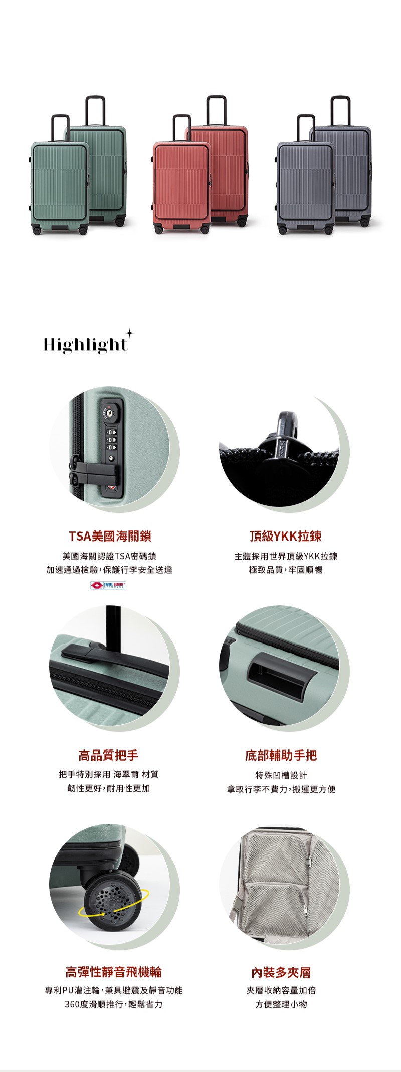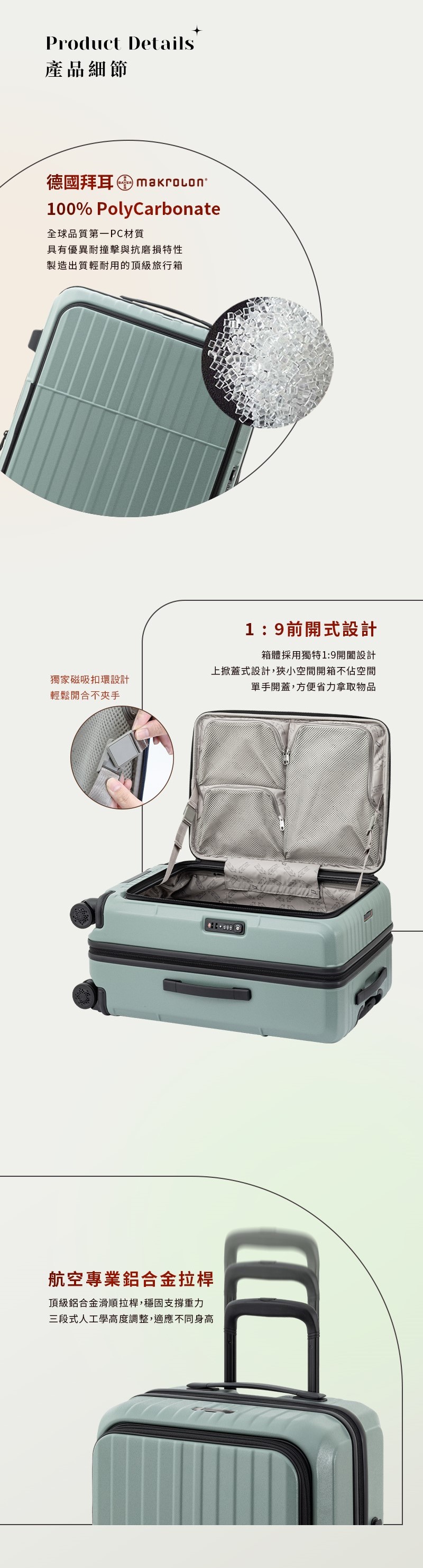 • 材質:箱殼 100% PC;內裡 100% POLYESTER