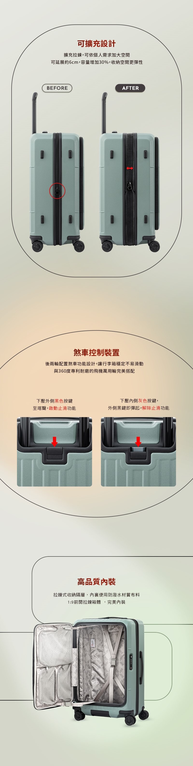 • 後兩輪配置煞車功能設計,讓行李箱穩定不滑動