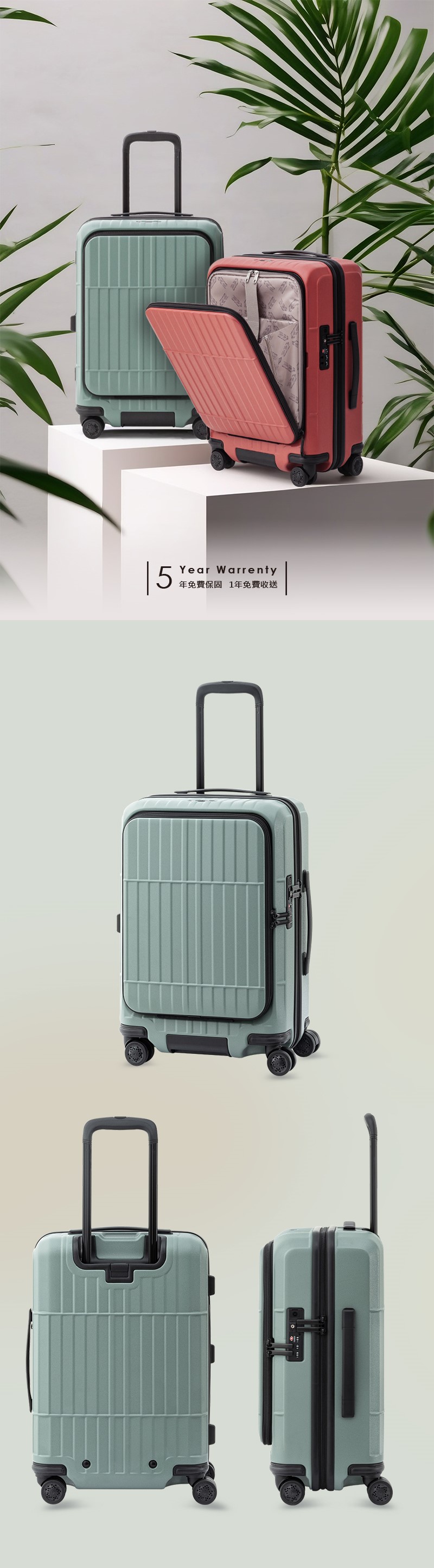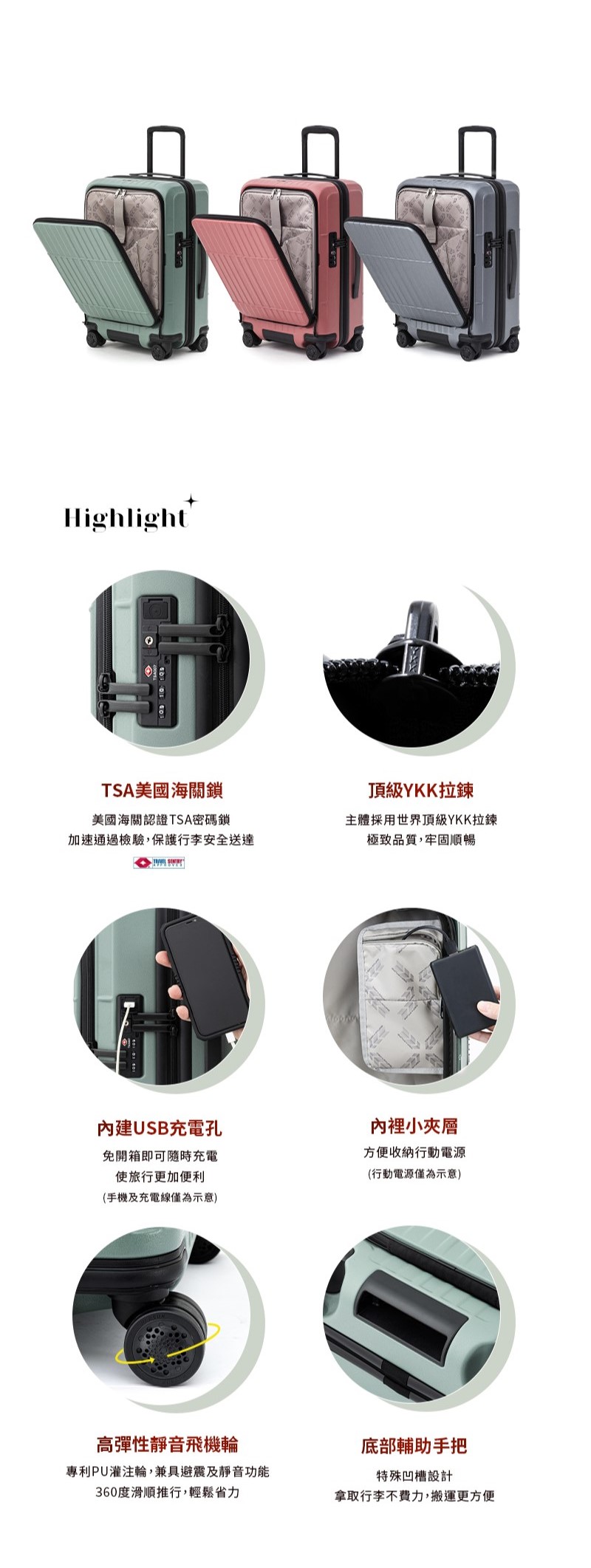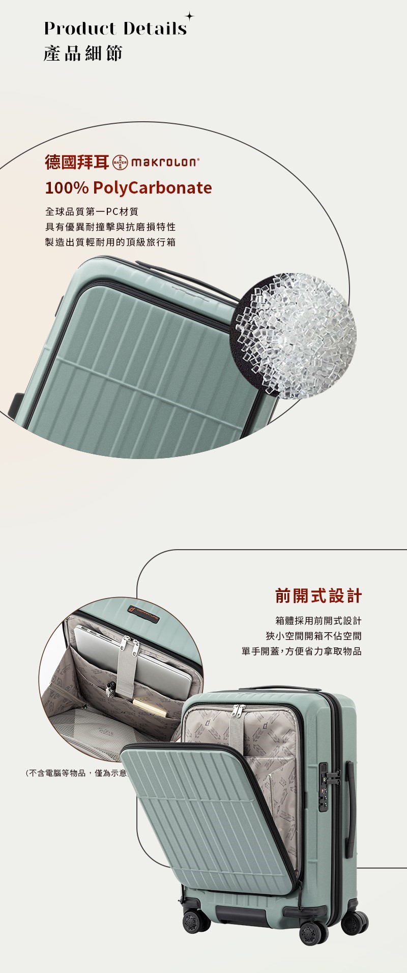 • 材質:箱殼 100% PC;內裡 100% POLYESTER